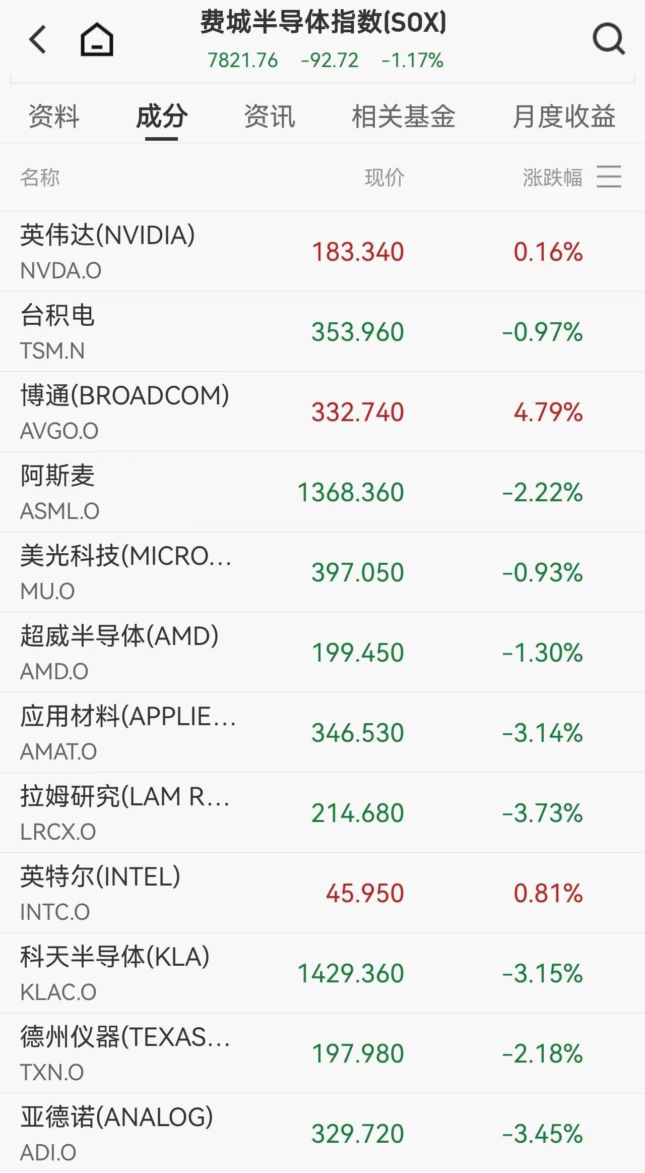 科技股走势分化,微软、亚马逊逆势收涨约1%,博通因AI芯片收入预期突破千亿美元而大涨超4%;但Meta、苹果、谷歌均跌近1%。半导体板块成为重灾区,费城半导体指数跌1.17%,闪迪跌超5%,应用材料、科天半导体等跌逾3%。中概股多数下跌,纳斯达克中国金龙指数跌1.4%,哔哩哔哩重挫7%,禾赛科技跌超6%。