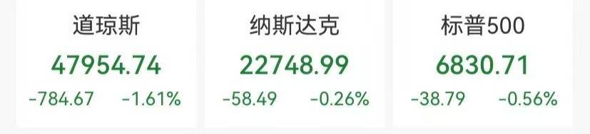 美股三大指数全线重挫,道琼斯指数盘中一度狂泻超1100点,最终收跌784.67点,跌幅达1.61%,报47954.74点;标普500指数跌0.57%,纳斯达克指数相对抗跌,但仍收跌0.26%。欧洲市场同步跟跌,德国DAX、法国CAC40及英国富时100指数均跌超1.4%。