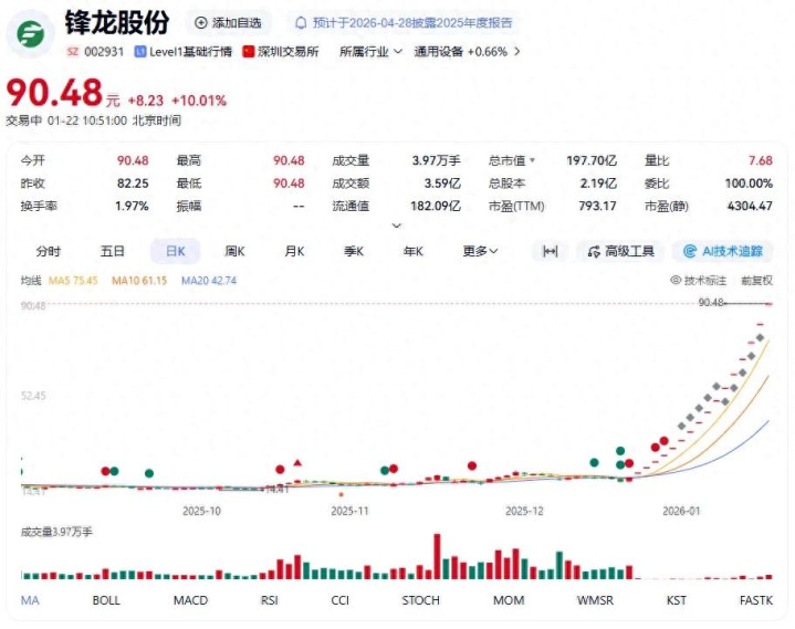 在A股震荡修复的市场环境中,锋龙股份(002931)以17连板的极端走势成为绝对焦点。从2025年12月中旬的17.61元低点,飙升至2026年1月22日突破90元的高位,35天内涨幅超356%,换手率长期维持在1%左右的极低水平,这种“一字板连阳+筹码高度锁定”的格局,让“没有散户”的吐槽在市场中广泛流传。但这波疯狂上涨绝非单一因素驱动,所谓“无散户”也只是表象,其背后是赛道风口、资本运作、监管逻辑与市场生态的多重共振。